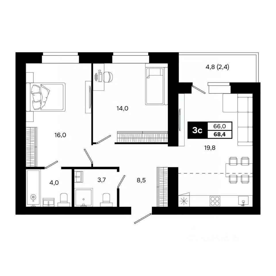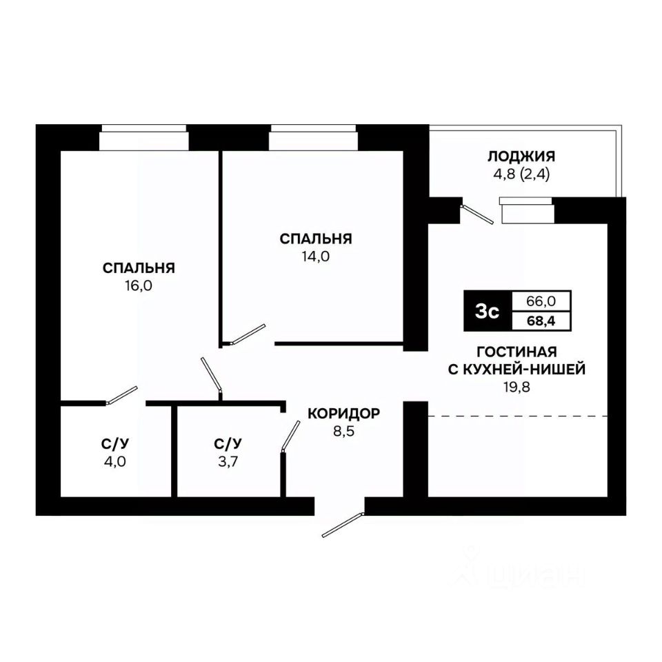Общая площадь68,4 м²