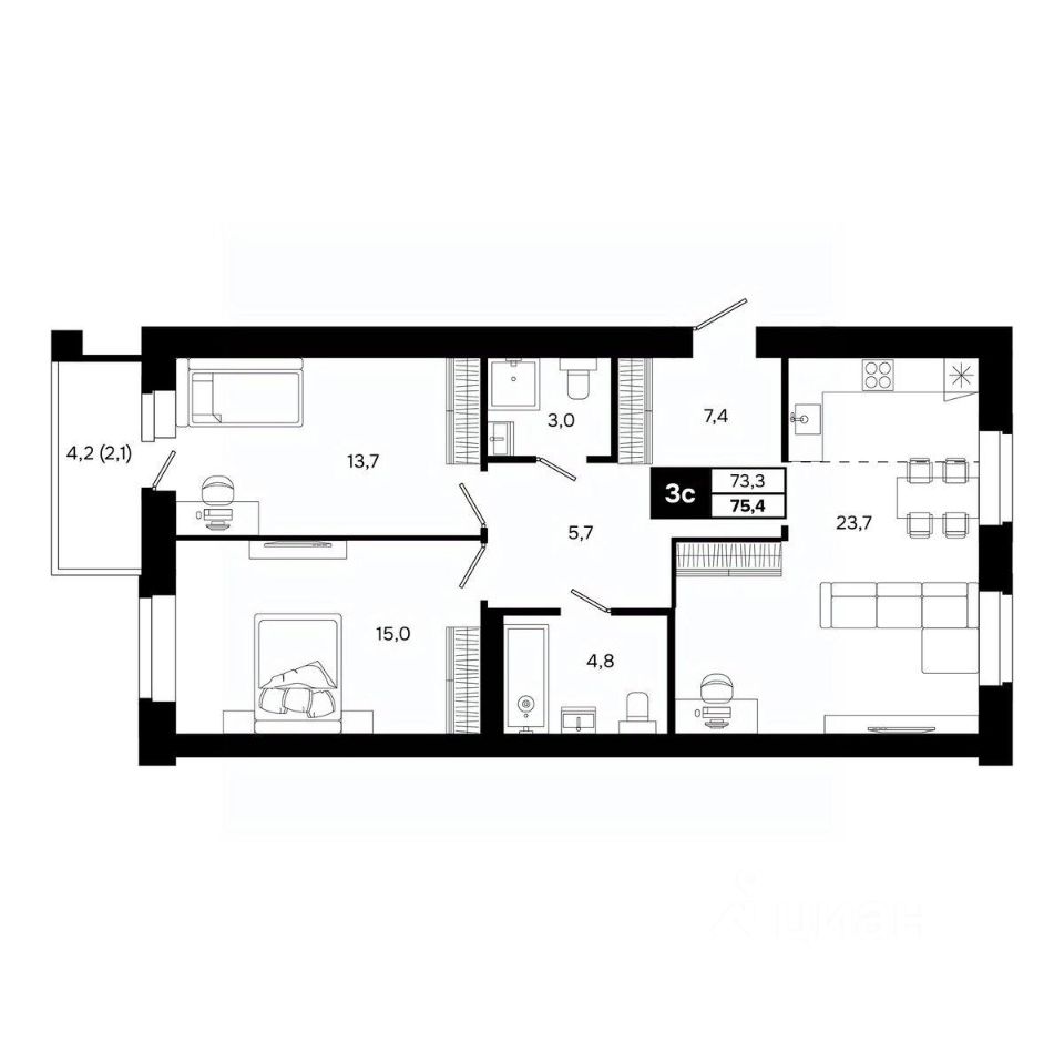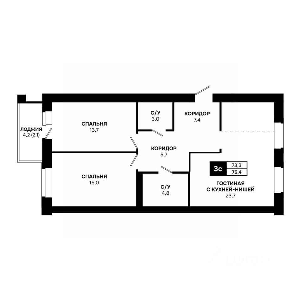 Общая площадь75,4 м²
