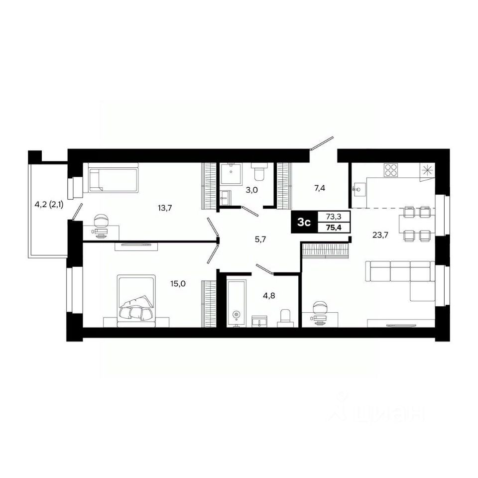 Общая площадь75,4 м²