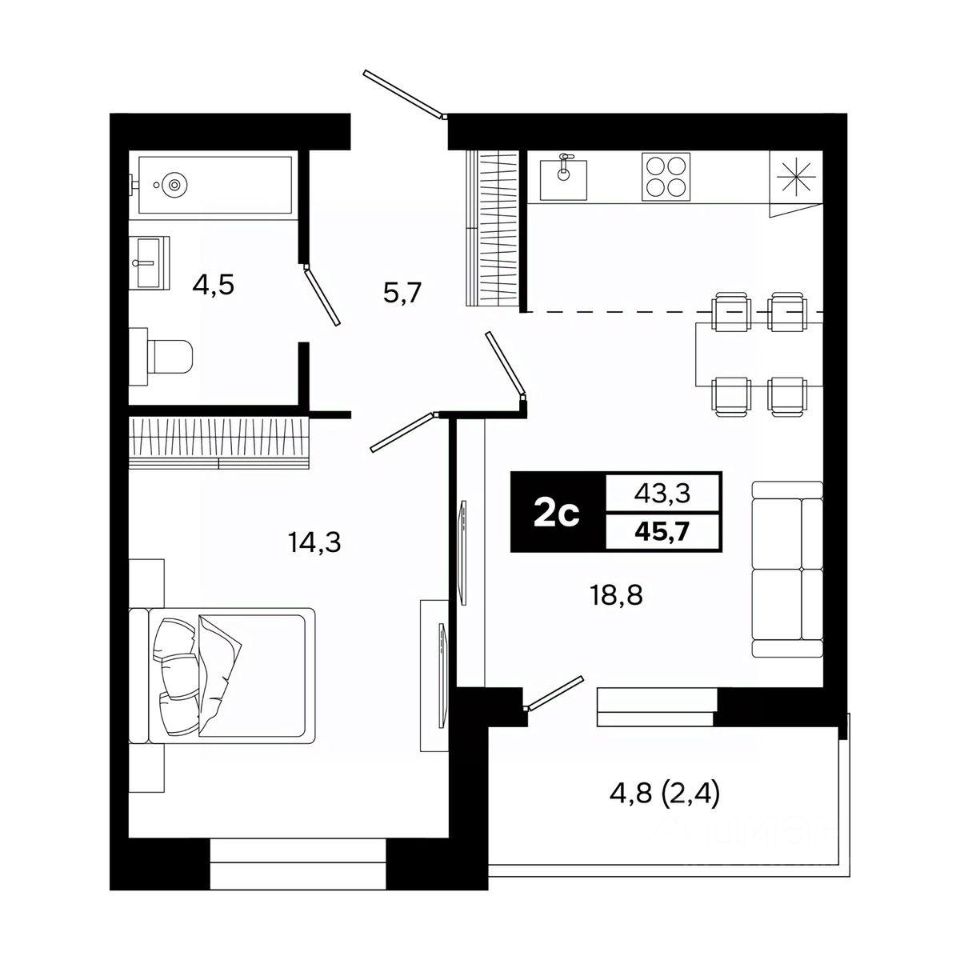 Общая площадь45,7 м²