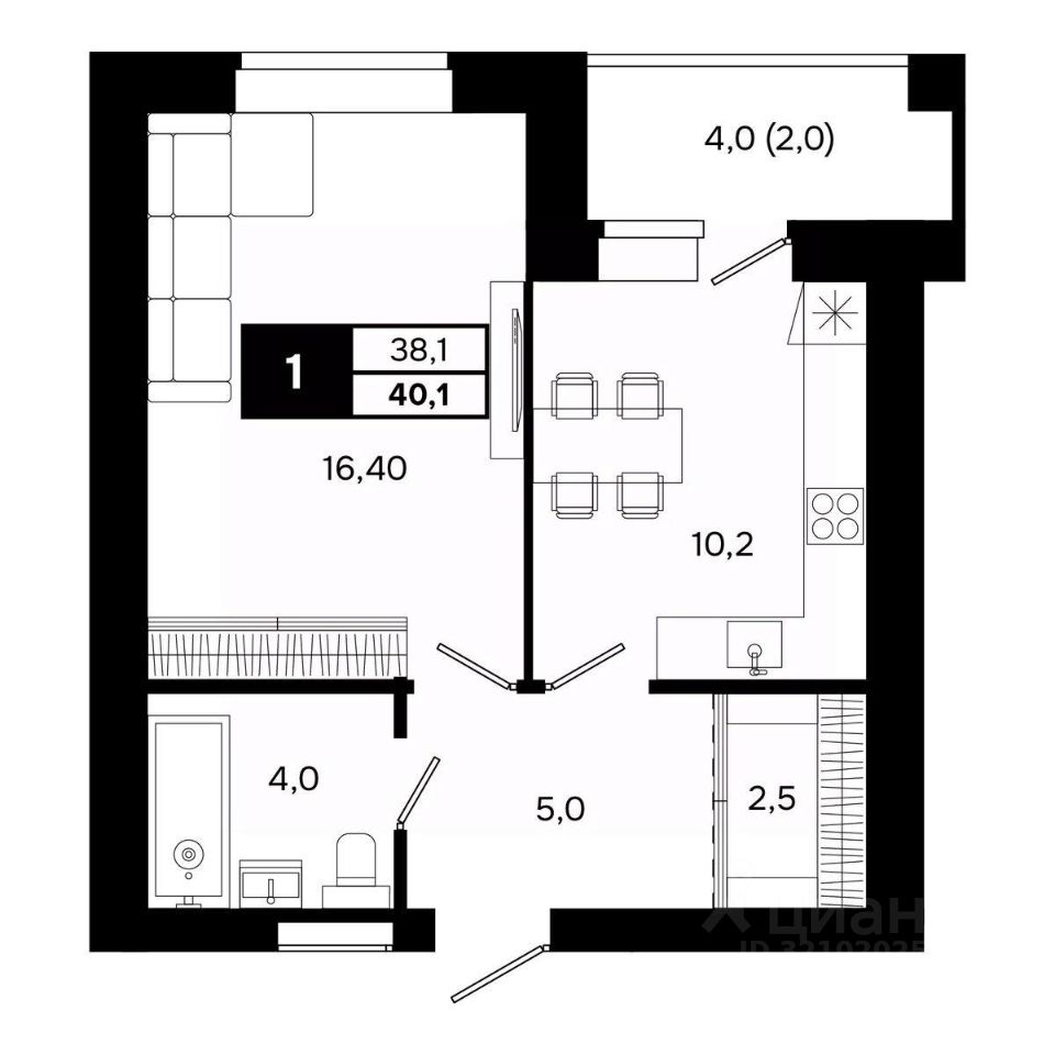 Общая площадь40,1 м²