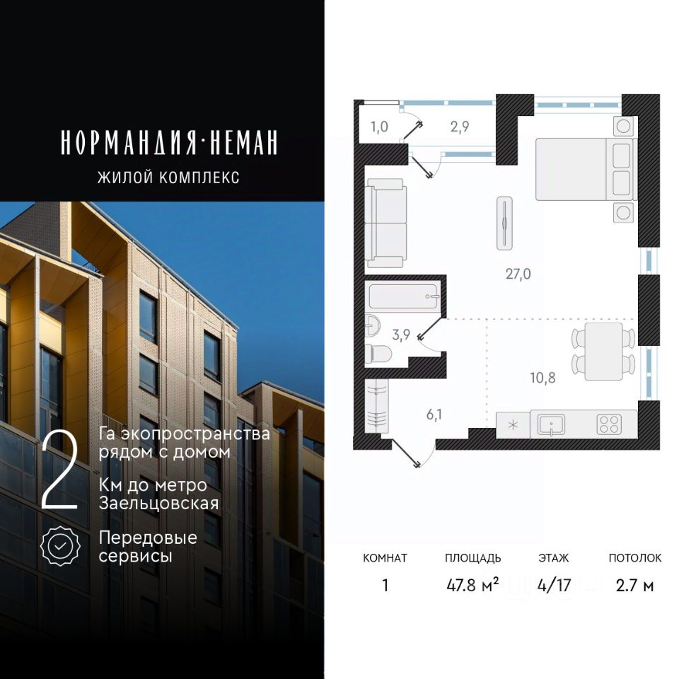 Продается 1-комн. квартира с предчистовой отделкой в ЖК "Нормандия - Неман" на 4 этаже. Общая площадь: 47.8 кв.м., жилая: 27 кв.м., площадь просторной кухни-столовой: 10.8 кв.м. Все окна выходят на одну сторону. В квартире одна лоджия, один совмещенный санузел. Высота потолков 2.7 м.