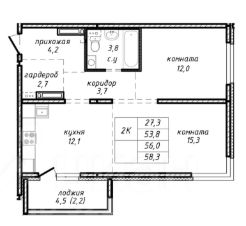 Продается двухкомнатная квартира в новостройке по адресу: Новосибирск, улица Связистов, 162к4с. Общая площадь квартиры составляет 58 кв. м, из которых 27.3 кв. м — жилая площадь и 12.1 кв. м — кухня. Квартира расположена на 11-м этаже 17-этажного панельного дома, построенного в 2024 году. Высота потолков — 2.7 метра.