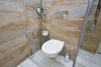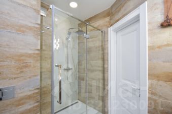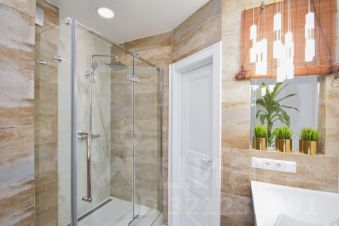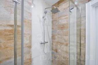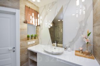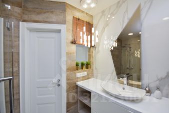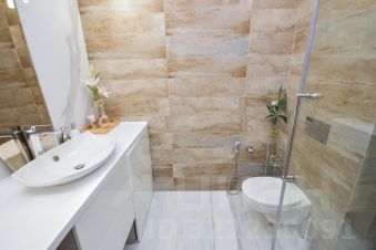 Ванная комната также отделана современными дорогостоящими материалами. Окно, которое связывает её с общим интерьером квартиры, добавляет света и ощущение простора, организовано много мест для хранения. Душевая кабинка с прочными стеклянными дверями выглядит очень эстетично и не загромождает пространство. Использование элитной французской сантехники "Jacob Delafon" тоже придаёт ванной комнате изыска и уюта.