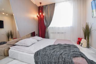 Большая гостиная с выделенной кухонной зоной оснащена уютным местом отдыха с панорамными окнами, а идеальное сочетание отделки стен, потолков, мебели и текстиля дают эффект светлого и просторного помещения. Во всей квартире на полу уложен широкоформатный керамогранит 90*180 производства Италии. Плюсом к этому система изысканных светильников создаёт атмосферу релакса, комфорта и хорошего настроения.