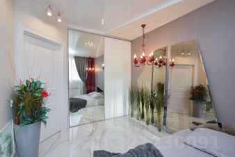 Раздвижная зеркальная дверь, разделяющая спальню и гардеробную комнату, не только экономит пространство, но и визуально увеличивает комнату, добавляя света за счёт отражений.