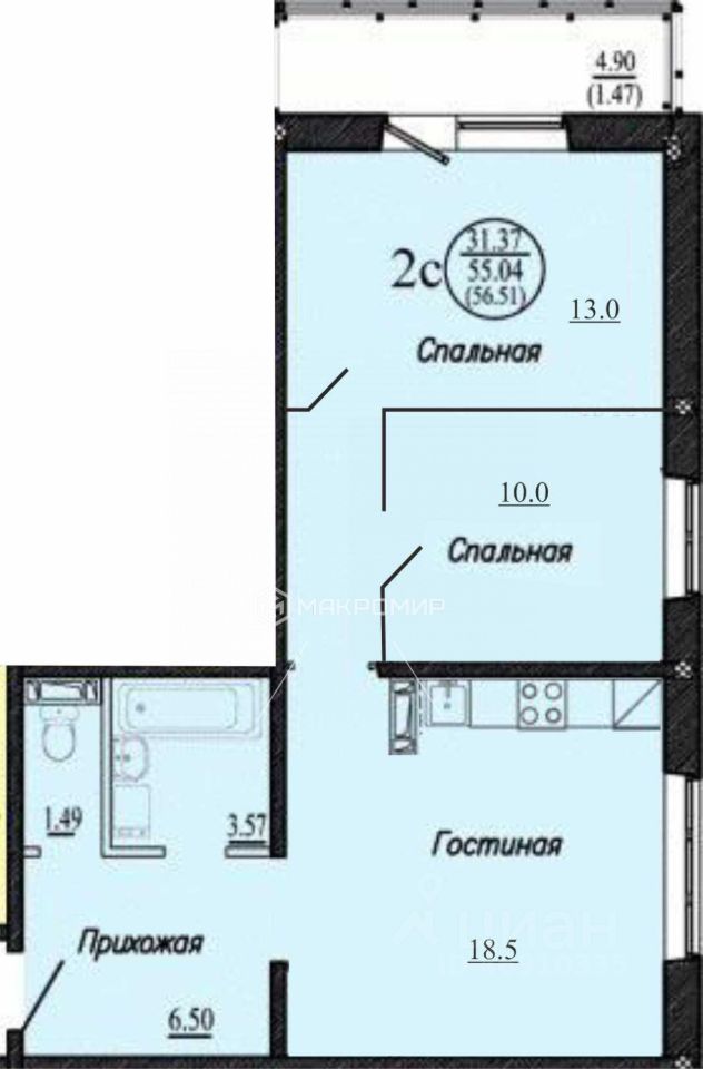 Две изолированные спальни на разные стороны и кухня-гостиная 18,5 кв.м. - очень функциональная планировка.