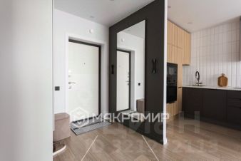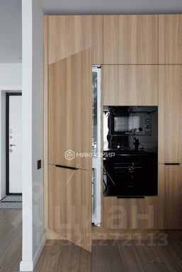 Кухонная зона со встроенной бытовой техникой, а так же шкаф в прихожей - выполнены на заказ.