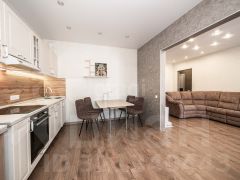 Объединенное пространство кухни-гостиной служит центром квартиры, создавая идеальные условия для жизни и приема гостей. Дополнительным преимуществом являются две изолированные лоджии, которые можно функционально использовать как зоны для отдыха или хранения. В доме функционируют пассажирский и грузовой лифты, что обеспечивает комфортное перемещение.