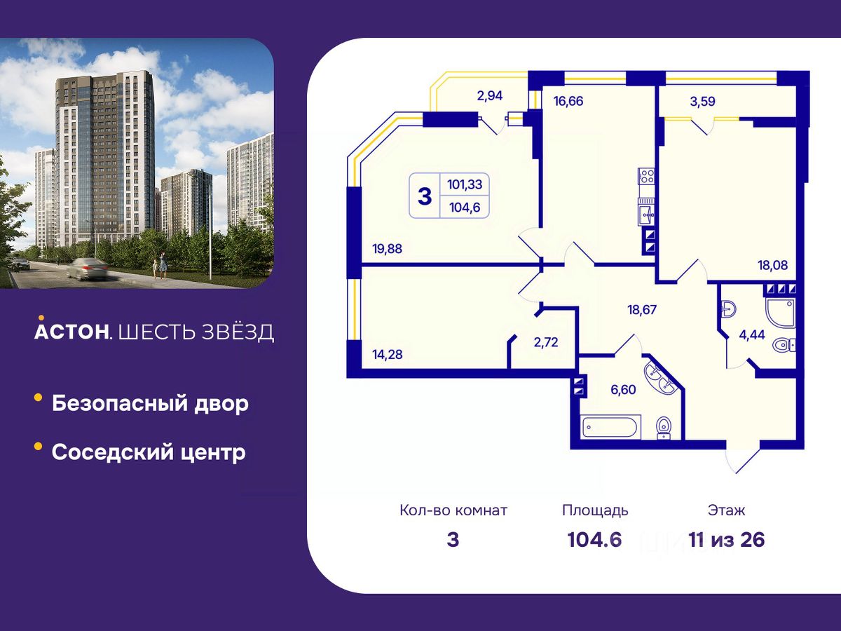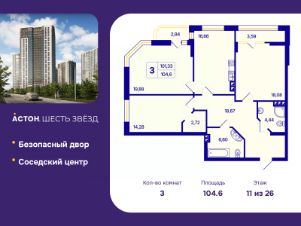 Трехкомнатная квартира с предчистовой отделкой в ЖК "Астон. Шесть Звезд" на 11 этаже. Общая площадь: 104.6 кв.м., жилая: 52.24 кв.м., площадь просторной кухни-столовой: 16.66 кв.м. Угловая квартира, идеально подойдет любителям тишины и панорамных видов. В квартире две лоджии, два совмещенных санузла. Высота потолков 2.65 м.