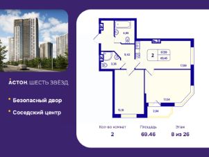 2-комн. квартира от застройщика с предчистовой отделкой в ЖК "Астон. Шесть Звезд" на 8 этаже. Общая площадь: 69.46 кв.м., жилая: 32.23 кв.м., площадь просторной кухни-столовой: 17.99 кв.м. Квартира угловая, окна oбecпeчивaют paвнoмepнoe ocвeщeниe в тeчeниe дня. В квартире одна лоджия, два совмещенных санузла. Высота потолков 2.65 м.