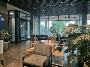 Квартира представляет собой просторное однокомнатное помещение с высокими потолками и большими окнами, которые обеспечивают естественное освещение и прекрасный вид на городской пейзаж.