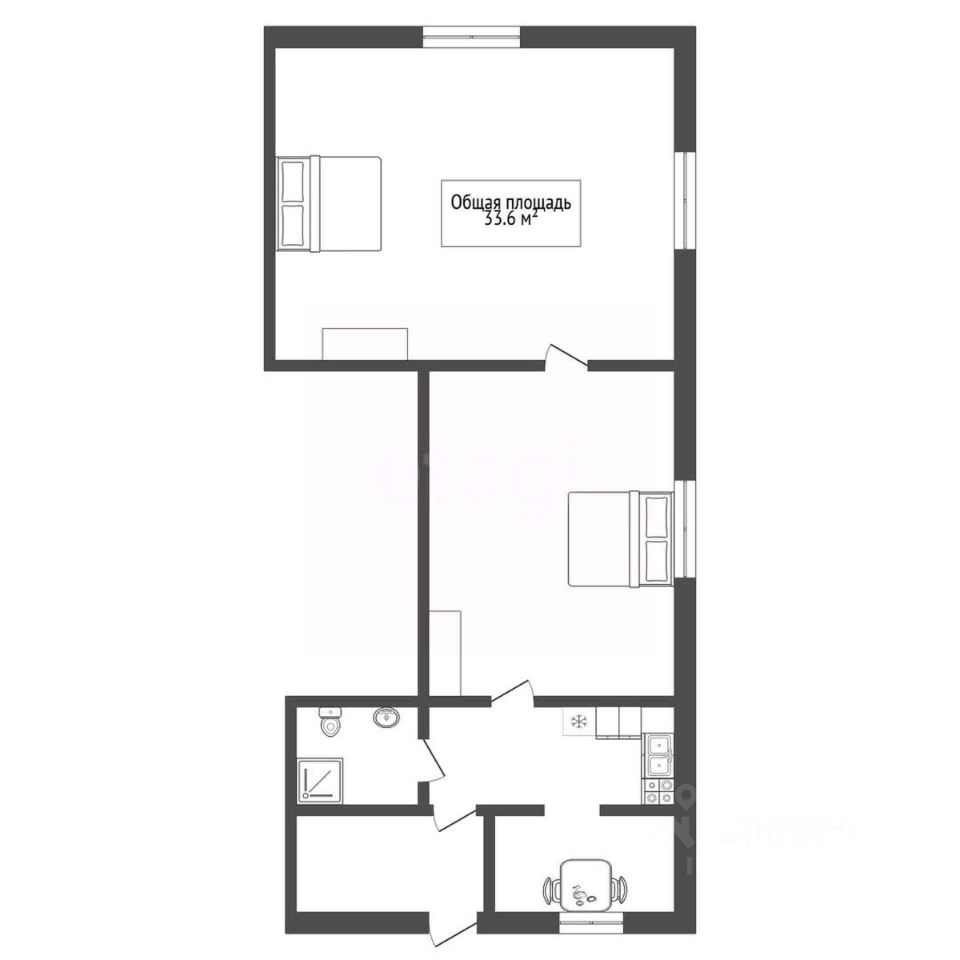 Планировка включает две спальные комнаты, отдельные кухню и небольшую столовую, а также санузел с душевой кабиной.