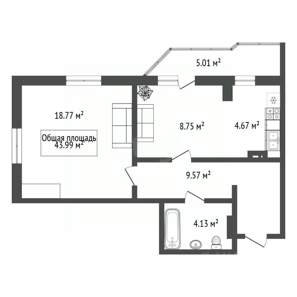Удобная планировка включает просторную гостиную с кухонной зоной оборудованна современной техникой и мебелью.
