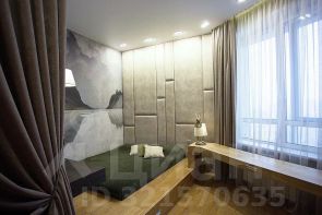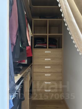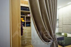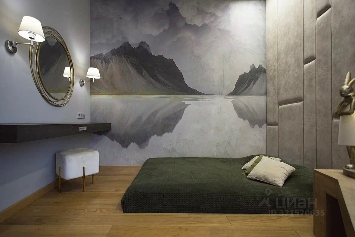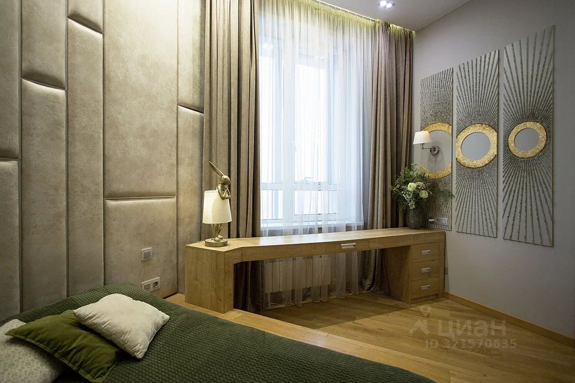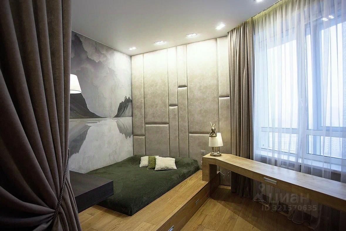 В спальне расположено уютное место для сна с ящиками для хранения, выделена рабочая зона, имеется собственная гардеробная секция и зеркало во весь рост.