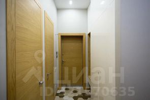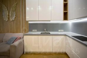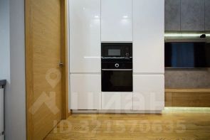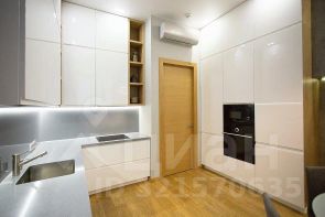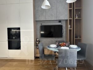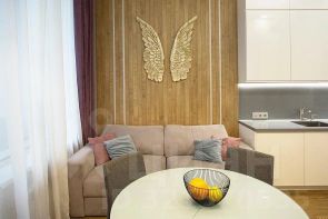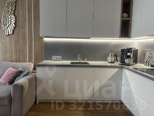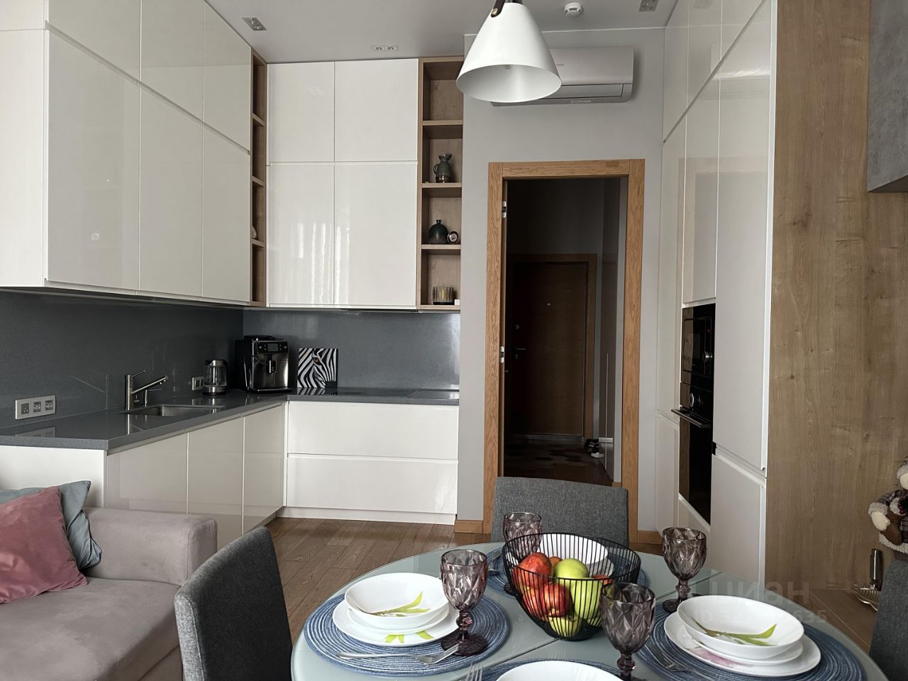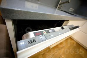 Кухня-гостиная оснащена необходимым гарнитуром, встроенной бытовой техникой (холодильником, духовым шкафом, микроволновой печью, варочной панелью, посудомоечной машиной), в гостиной зоне есть телевизор, раздвижной кухонный стол, 4 стула и раскладной диван. Дополнительно установлен кондиционер. Прихожая оборудована вместительной гардеробной системой. Материалы пола - керамогранит и паркет.