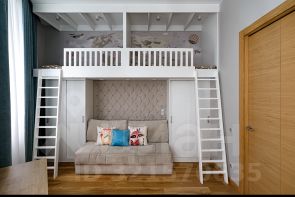 Детская рассчитана на двух детей, с интересным симметричным спальным решением, что освобождает внизу пространство для игр. Рабочая зона находится слева от входа в комнату.