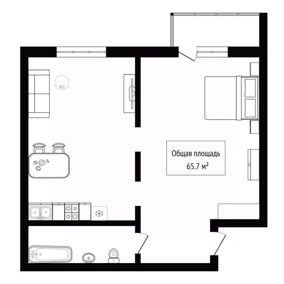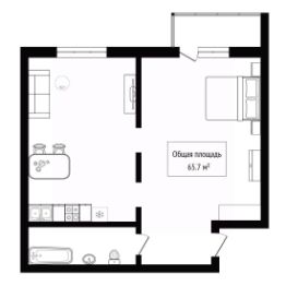 На 65м2 расположились входная зона, большой совмещенный санузел, просторная кухня-гостиная, которая легко делится на 2 зоны, спальня с большим окном и вторая комната без окна(порядка 12м), которая используется как зона хранения, но вполне может стать кабинетом или еще одной жилой комнатой.