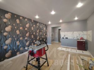 ванная комната выложена кафелем, установлена сантехника, пол выложен ламинатом, поклеены обои, завершен монтаж натяжных потолков, в кухонной зоне смонтирована проводка.