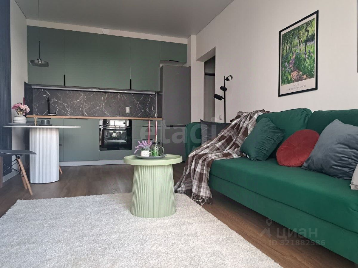 Спальня-гостиная с удобным диваном-трансформером, который легко превращается в полноценное спальное место, тумбой под ТВ и современным телевизором с голосовым управлением — ваши вечера станут ещё уютнее!