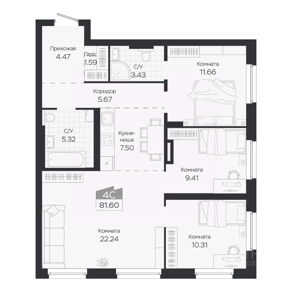 Продаётся 4-комнатная квартира в строящемся доме (Дом 3), срок сдачи: IV-кв. 2027, общей площадью 81.6 кв.м., на 8 этаже. Новый жилой комплекс "Базилик" от застройщика "Группа Мета" расположен в рп. Краснообск Новосибирской области на ул. Восточная.