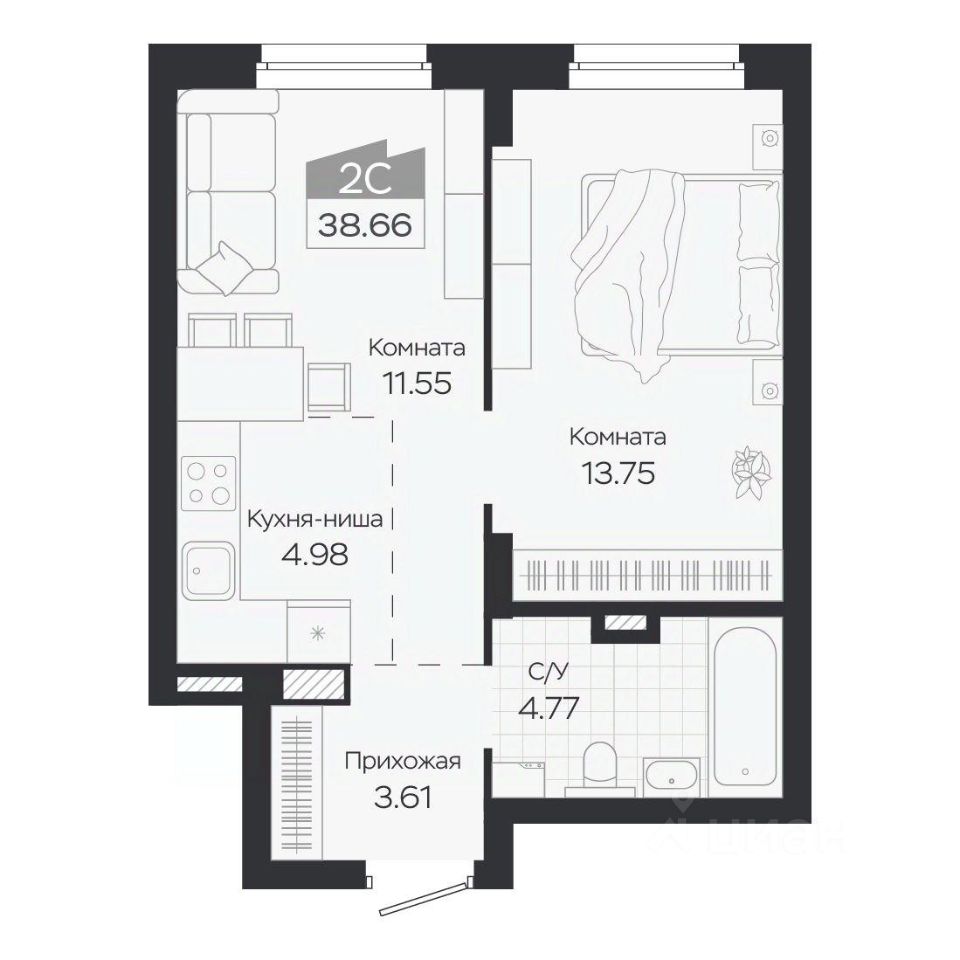 Продаётся 2-комнатная квартира в строящемся доме (Дом 3), срок сдачи: IV-кв. 2027, общей площадью 38.66 кв.м., на 2 этаже. Новый жилой комплекс "Базилик" от застройщика "Группа Мета" расположен в рп. Краснообск Новосибирской области на ул. Восточная.