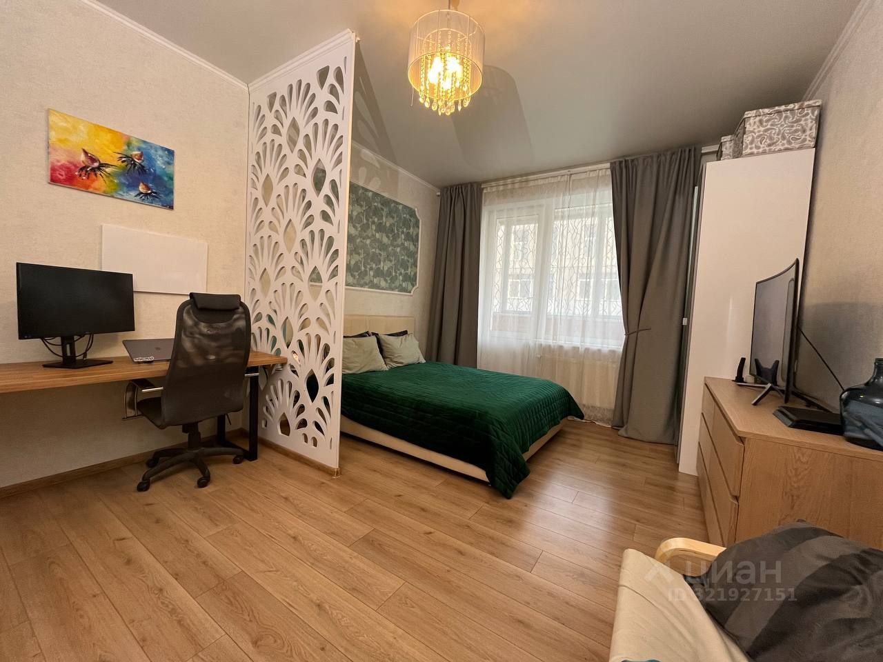 Большая светлая комната: 18.9 кв.м. легко зонируется на спальную и рабочую зоны.