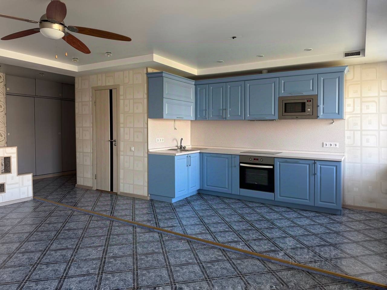 Натяжные потолки, несколько вариантов освещения, качественная сантехника и надежная входная дверь, в отсечке на две квартиры.