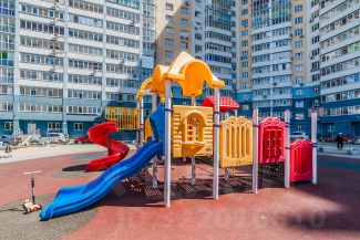Просторная детская площадка во дворе дома.