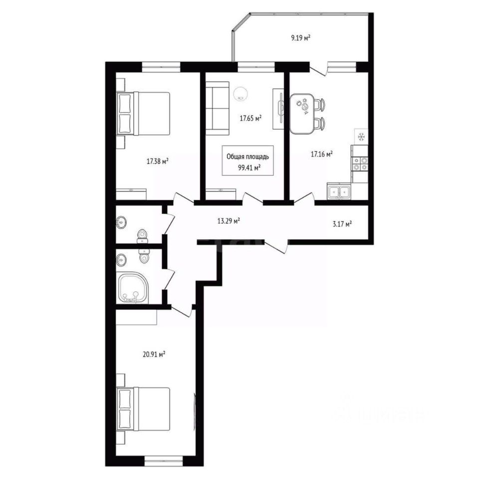 В продаже уникальная 3 комнатная квартира общей площадью 99,4 кв м, которая расположена на 17 этаже 19-ти этажного кирпичного дома в Заельцовском районе.
