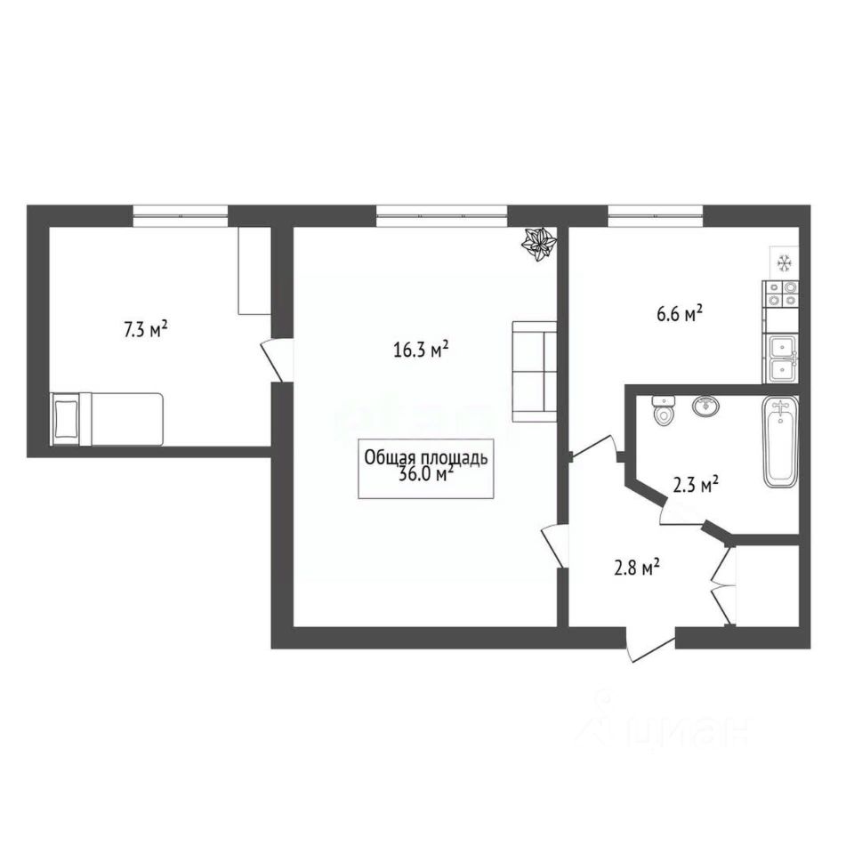 Квартира отличается продуманной планировкой: просторная гостиная 16.3 кв.м , кухня, спальня, выход на утепленный балкон, оборудованный качественной сантехникой санузел.
