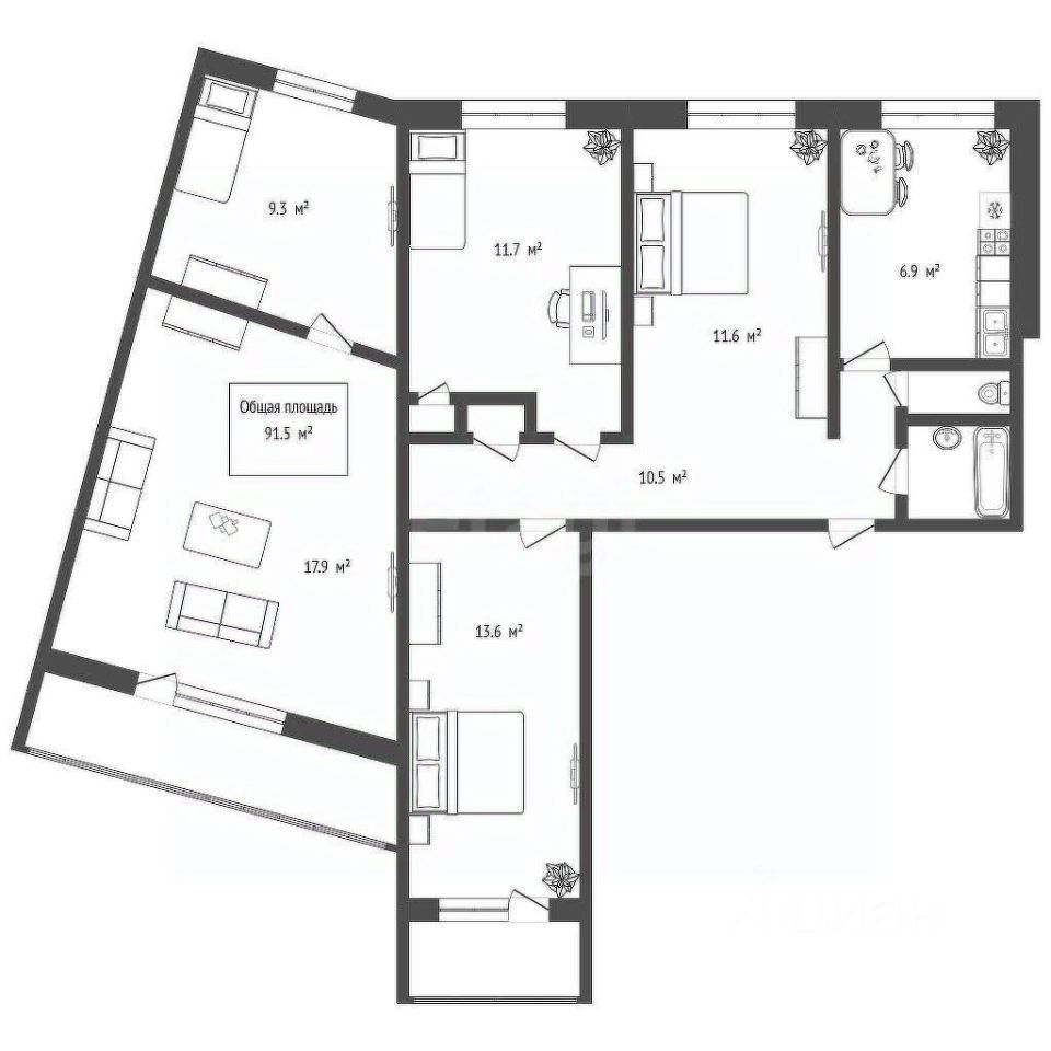 Площади комнат составляют 17.9 м², 13.6 м², 11.6 м², 11 м² и 9.3 м², кухня — 7 м².