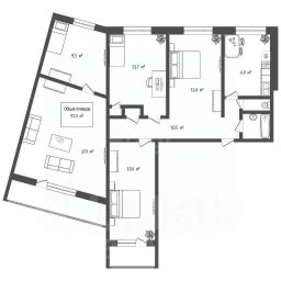 Просторная пятикомнатная квартира общей площадью 91.5 м² предназначена для комфортного проживания большой семьи.