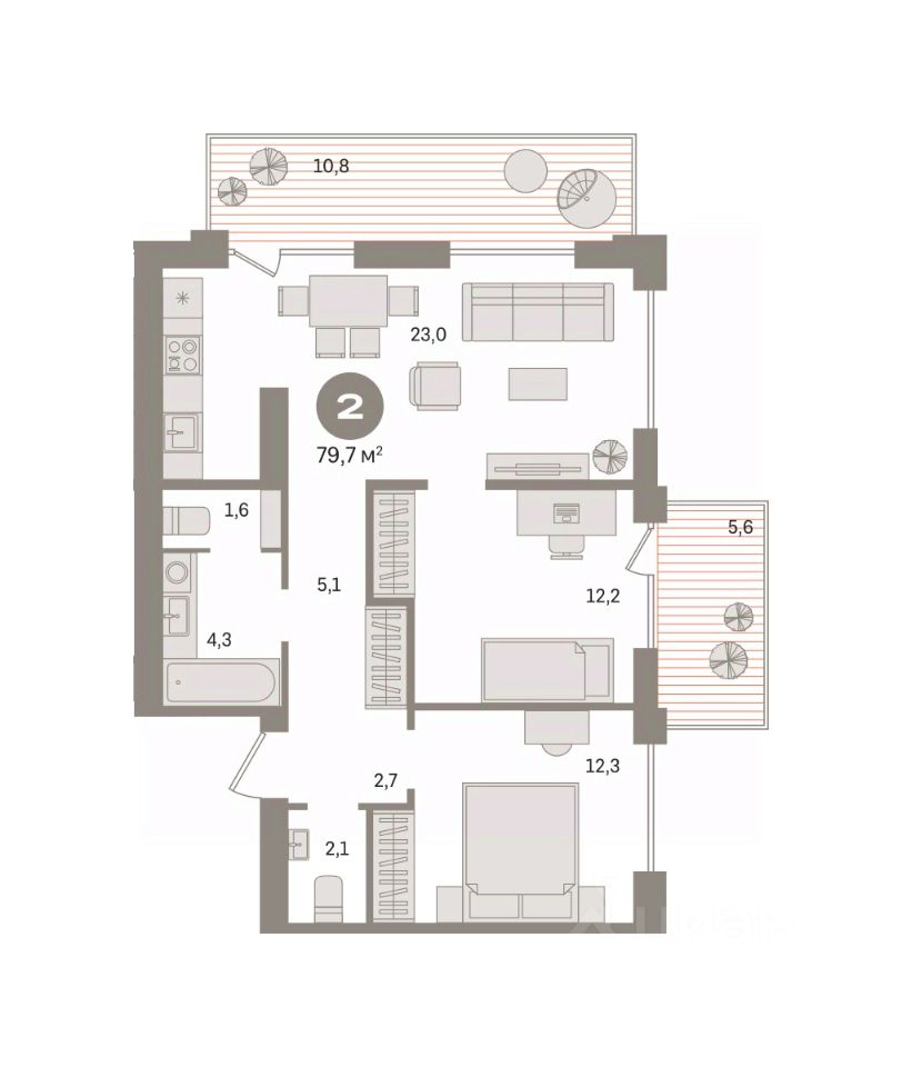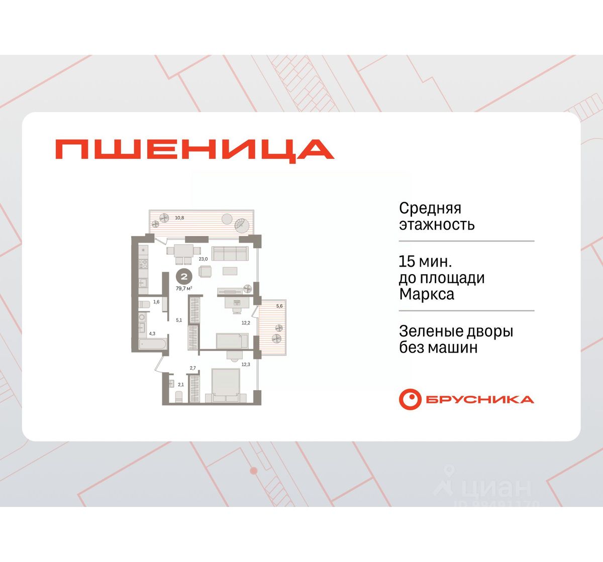 Квартира с кухней-гостиной и двумя спальнями в жилом районе "Пшеница". Особенности планировки: второй санузел, вид во двор, разнесённые спальни, предчистовая отделка, балкон.