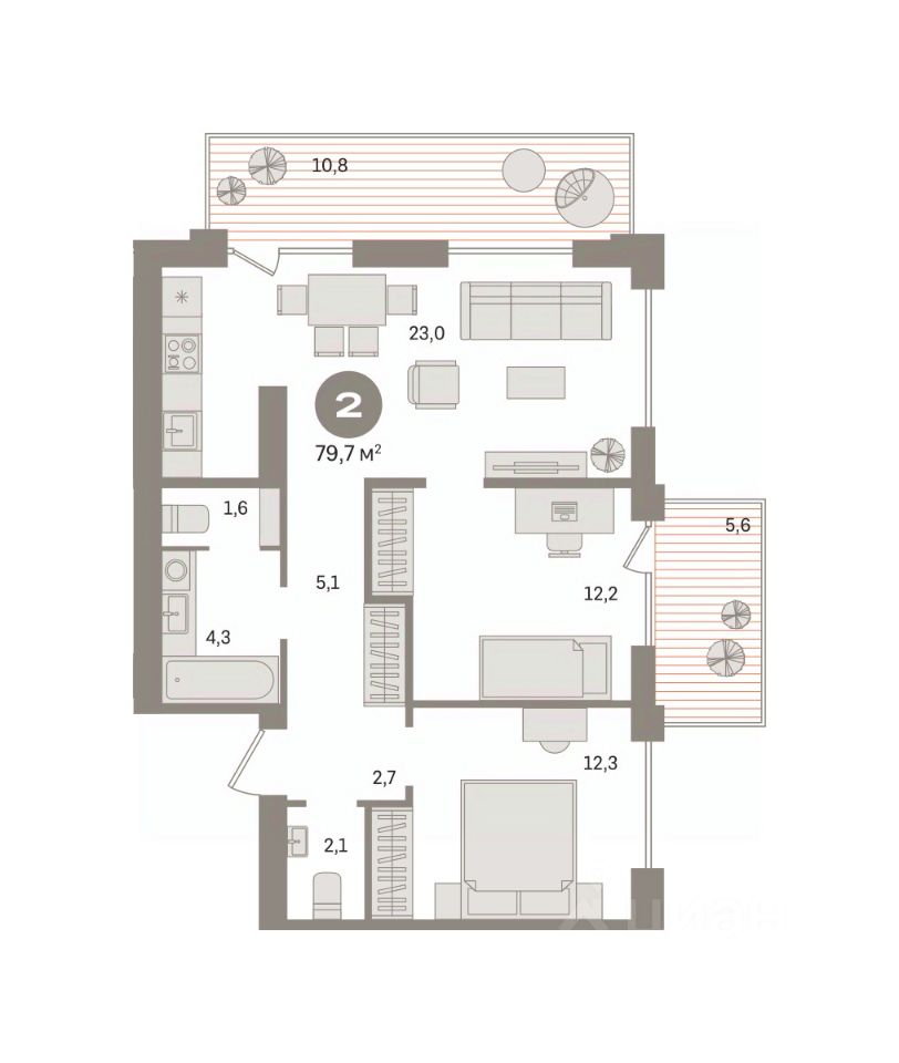 Квартира с кухней-гостиной и двумя спальнями в жилом районе "Пшеница". Особенности планировки: второй санузел, вид во двор, разнесённые спальни, предчистовая отделка, балкон.