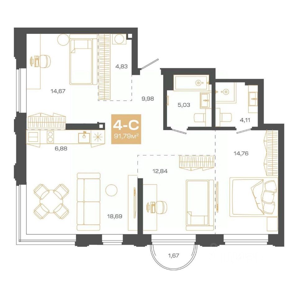 Продаётся 4-комнатная квартира в строящемся доме (Блок-секция 1), срок сдачи: II-кв. 2026, общей площадью 91.79 кв.м., на 16 этаже. Пульсар - это современный дом с развитой инфраструктурой по ул.Мусы Джалиля. Детские сады, школы, поликлиники и парки для прогулок в 5 минутной доступности.