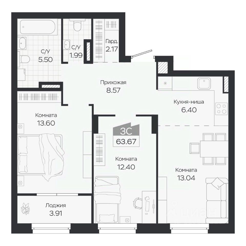 Продаётся 3-комнатная квартира в строящемся доме (Дом 3), срок сдачи: IV-кв. 2027, общей площадью 63.67 кв.м., на 7 этаже. Новый жилой комплекс "Базилик" от застройщика "Группа Мета" расположен в рп. Краснообск Новосибирской области на ул. Восточная.