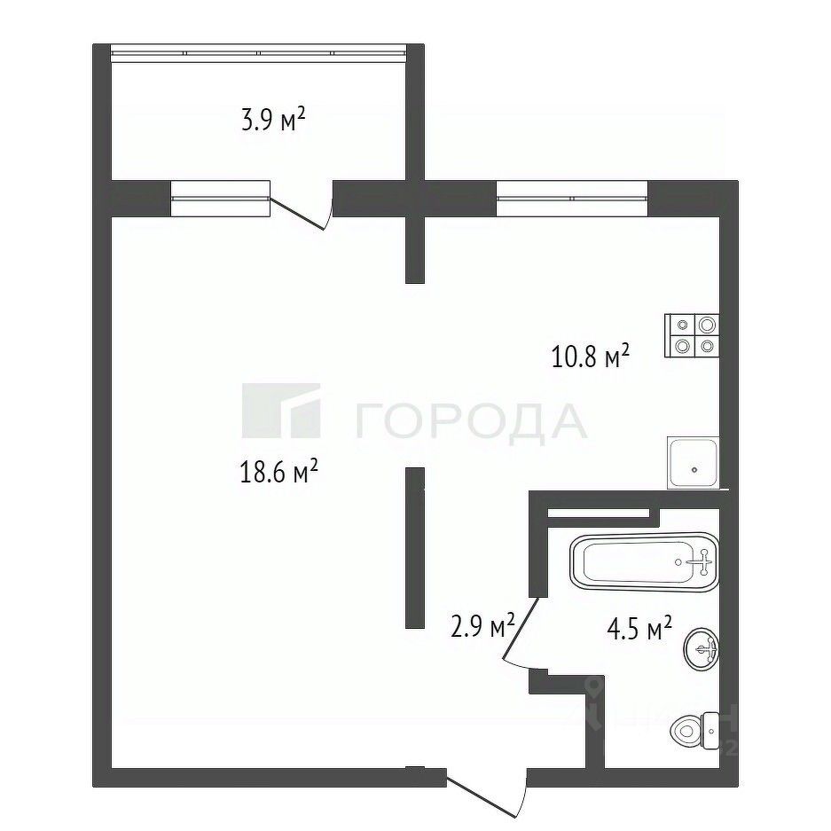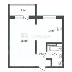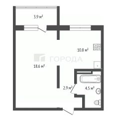 Кухня - 10,8 кв.м., комната - 18,6 кв.м.
