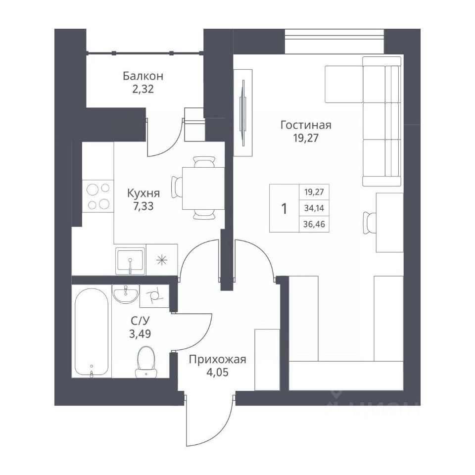 Общая площадь36,46 м²