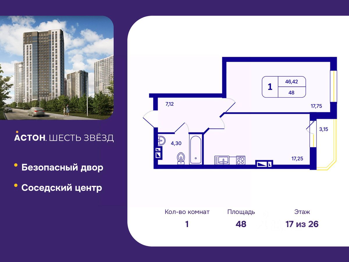 Просторная 1-комн. квартира с предчистовой отделкой в ЖК "Астон. Шесть Звезд" на 17 этаже. Общая площадь: 48 кв.м., жилая: 17.75 кв.м., площадь просторной кухни-столовой: 17.25 кв.м. Все окна выходят на одну сторону. В квартире одна лоджия, один совмещенный санузел. Высота потолков 2.65 м.