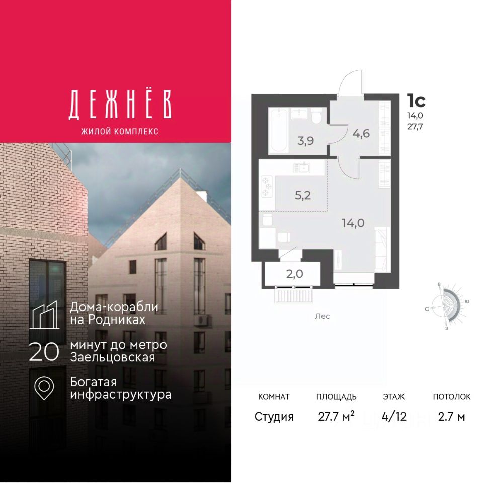 Просторная однокомнатная квартира-студия с предчистовой отделкой в ЖК "Дежнёв" на 4 этаже. Общая площадь: 27.7 кв.м., площадь гостиной 19.2 кв.м., из которых 5.2 кв.м. выделено под кухонную зону. Все окна выходят на одну сторону. В квартире одна лоджия, один совмещенный санузел. Высота потолков 2.7 м.