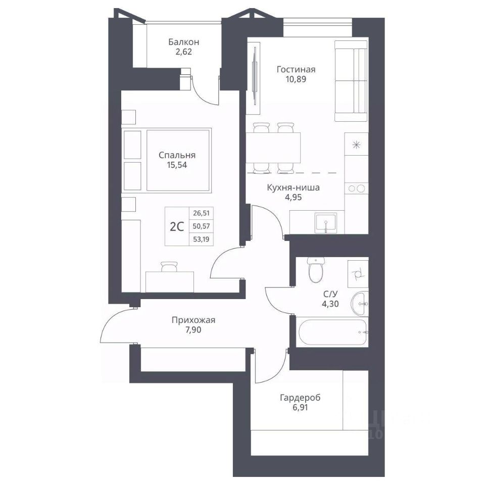Продается 2-комн. студия с отделкой White box. Квартира расположена на 2 этаже 24 этажного монолитно-кирпичного дома в Акцентном доме "Актив" от группы компаний "Поляков".
