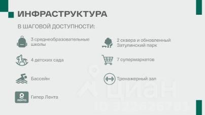 - Образовательные учреждения: в пешей доступности школы, гимназия, детские сады, языковой центр, школа робототехники и программирования.