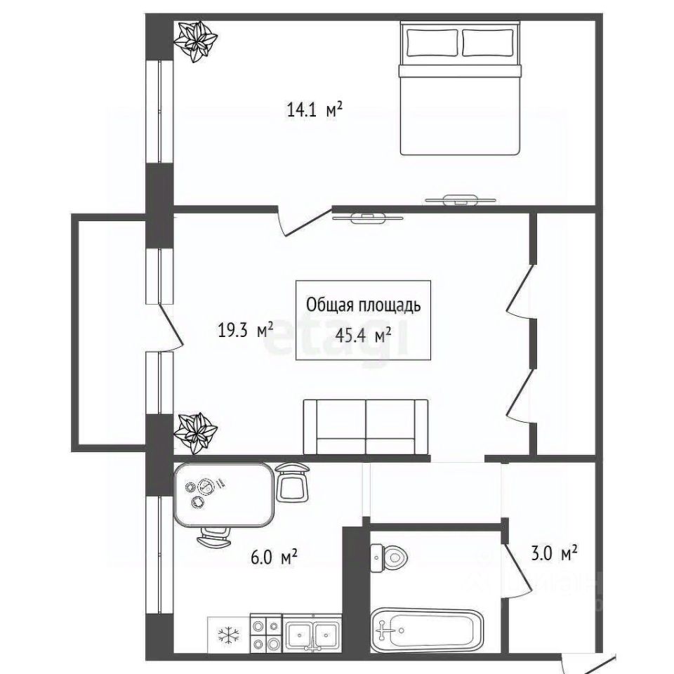 Общая площадь: 45,4 м²