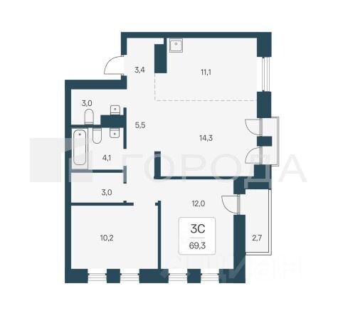 Общая площадь составляет 69,3 кв. м.