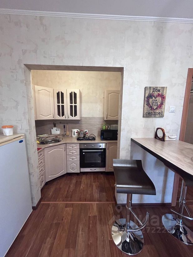 В стоимость квартиры входят: кухонный гарнитур с навесными шкафами и раковиной, духовой шкаф, холодильник, барная стойка и два стула, шкаф, комод, две прикроватные тумбы, двухспальная кровать в комнате, шкаф и тумба под обувь в коридоре.