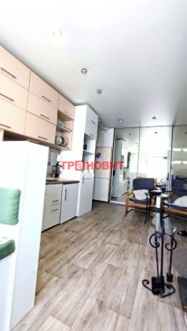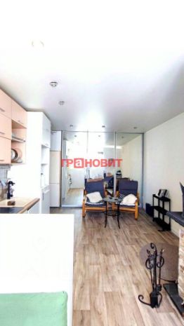 Кухня-гостиная с отдельной обеденной зоной и зоной отдыха, кухонная мебель (с встроенной духовкой и варочный поверхностью), вместительный, встроенный зеркальный шкаф, холодильник, диванчик.