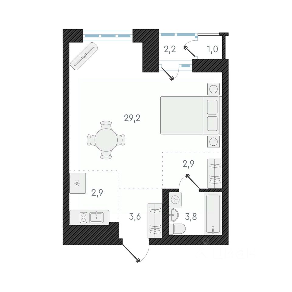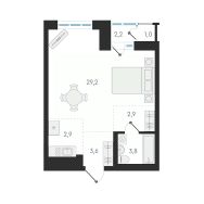 1-комн. квартира-студия от застройщика с предчистовой отделкой в ЖК "Нормандия - Неман" на 6 этаже. Общая площадь: 42.4 кв.м., площадь гостиной 32.1 кв.м., из которых 2.9 кв.м. выделено под кухонную зону. Все окна выходят на одну сторону. В квартире одна лоджия, один совмещенный санузел. Высота потолков 2.7 м.