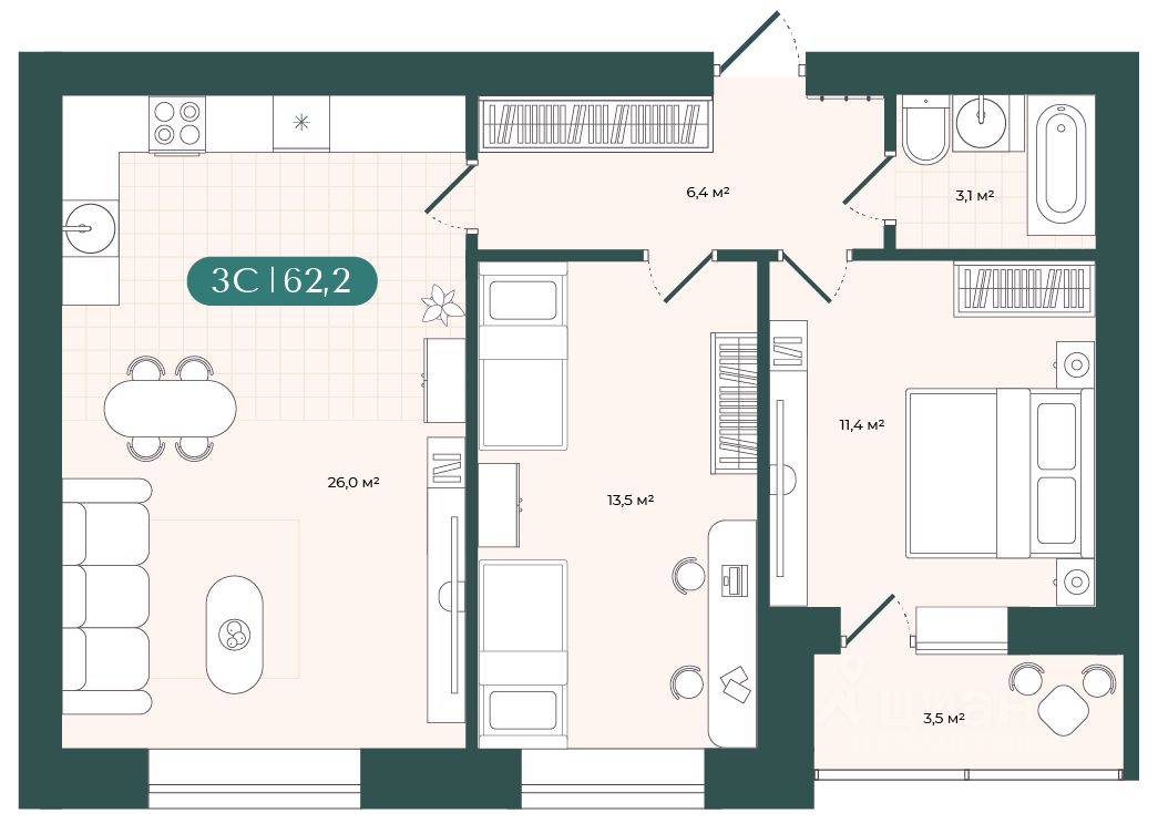 Общая площадь62,15 м²