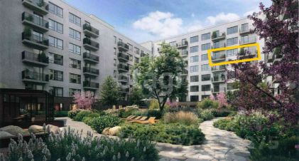 Комфортная планировка - две отдельные спальни, два санузла и просторная кухня-гостиная. Окна выходят на юго-восток, во двор, с видом на ландшафтный дизайн Брусники - цветущий сад.